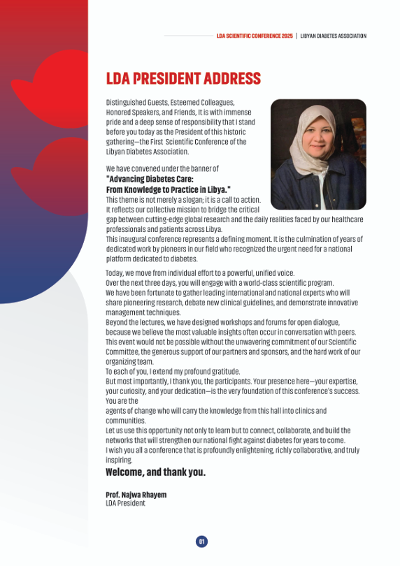 LDA 2025 is not just a gathering, but a landmark in diabetes care. Join us as we make LDA 2025 the biggest scientific event in the field of diabetes in Libya, bringing together elite doctors and experts from all over Libya with a strong international presence.